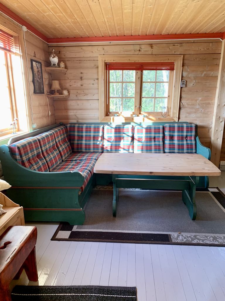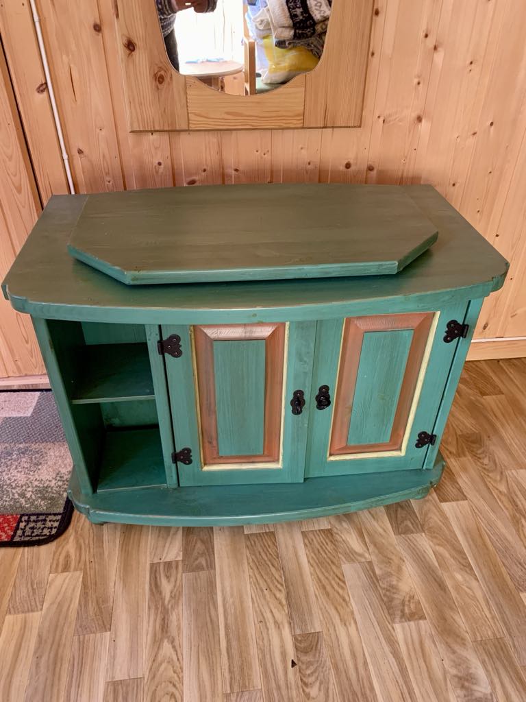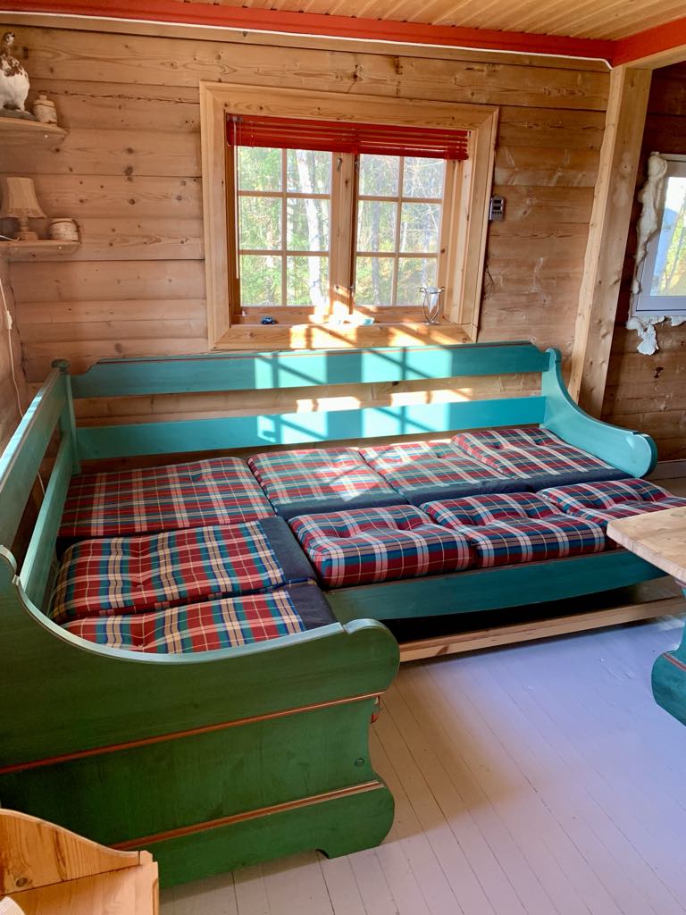 Hyttesofa, kan gjøres om til dobbeltseng. Krogenes møbler. 400kr for sofa og 100kr for TV-bord.